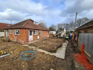 The installation of drainage and foundations require expert knowledge and skilled engineering. This comprehensive undertaking required meticulous planning and precise execution to ensure the efficient and effective management of water and the establishment of a solid foundation for this home in the picturesque village of Eversley.